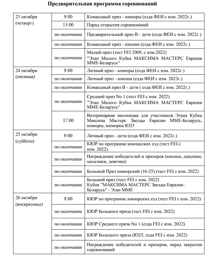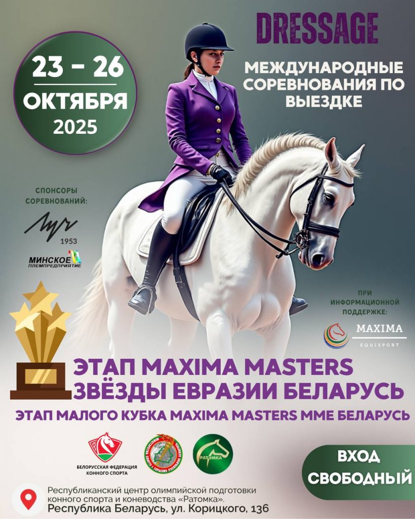 С 23 по 26 октября на базе учреждения «Республиканский центр олимпийской подготовки конного спорта и коневодства» вновь пройдут международные соревнования «Этап Максима Мастерс Звезды Евразии» и «Этап Малого Кубка Евразии», а также международные соревнования по выездке среди юниоров, юношей и детей.
